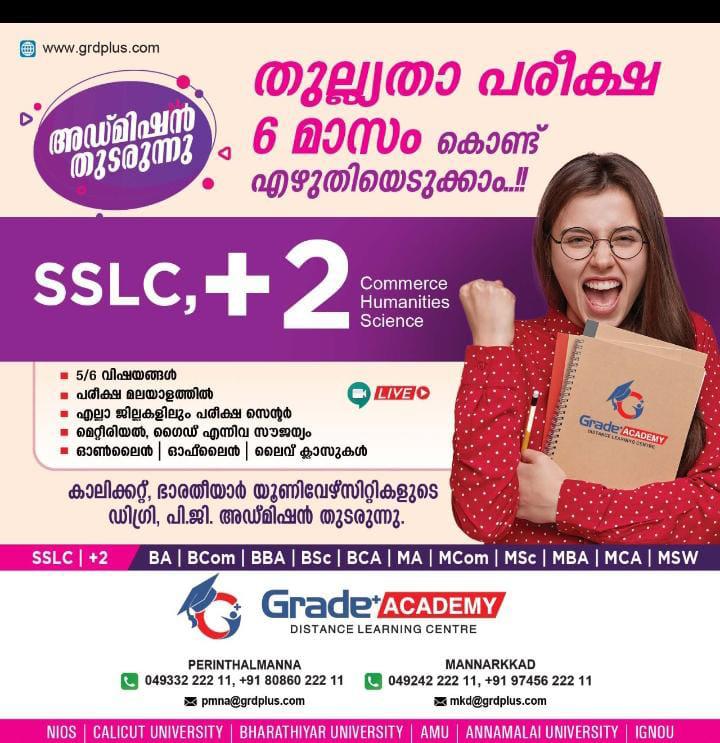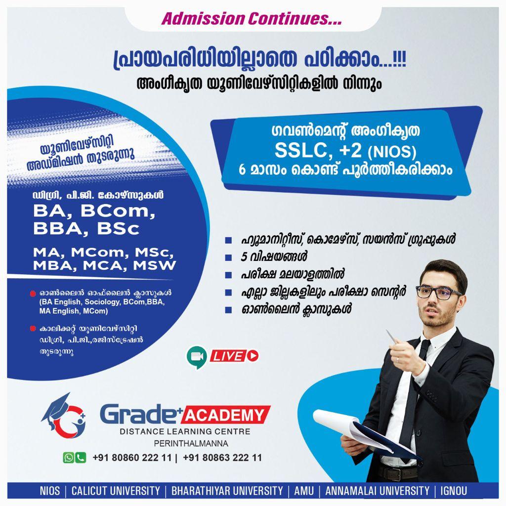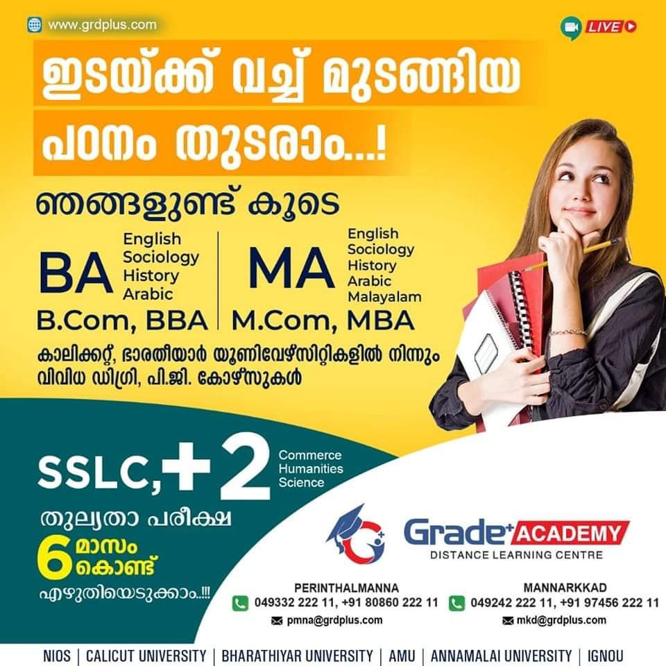 Grade+ Academy is a private educational institution specializing in distance learning located with head office at Perinthalmanna, Malappuram. Our first branch opened in Mannarkkad and expecting some more very soon. We are providing exclusive service and quality classes for whom wish to achieve graduation and post-graduation from a number of Universities, approved by UGC. Apart from UG and PG, we are providing classes for 6 months SSLC and Plus 2 under NIOS.